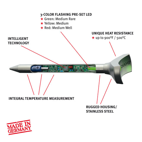 هذا المقياس الالكتروني دقيق جدا و يقيس درجة الحرارة على طول الحساس ليحدد متوسط حرارة قطعة اللحم، و ليس مجرد حرارة منطقة صغيرة. يتميز بصغر حجمه و سهولة حمله و استخدامه و هو آمن للاستخدام على الأطعمة و على درجات حرارة عالية حيث أنه مصنوع في ألمانيا من أفضل أنواع الستاينلس ستييل. مقاوم للحرارة حتى ٤٨٠ درجة مئوية، و به بطارية مدمجة تدوم حتى ٢٠ سنة و أكثر من ١٠٠٠ استخدام، و يمكن غسله بشكل يدوي بالماء و الصابون. ضمان لمدة ٢٤ شهر.