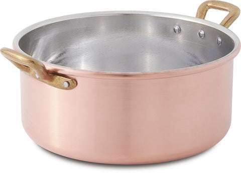 هذا القدر من مجموعة تراديشونال و التي تتميز بتصميم ناعم و أنيق و براق. مصنوع من النحاس الذي يعتبر أفضل موصل للحرارة على الاطلاق و الذي يقوم بتوزيع الحرارة بشكل متساوي للحصول على نتيجة مذهلة في الطبخ. مصنوع يدويا في إيطاليا من أفضل أنواع النحاس و بمقابض و مسامير من النحاس الأصفر المتين.