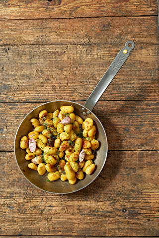 Round fry pan with a Lyonnaise profile to enable the food to easily slide onto a dish; ideal for searing, grilling, browning.