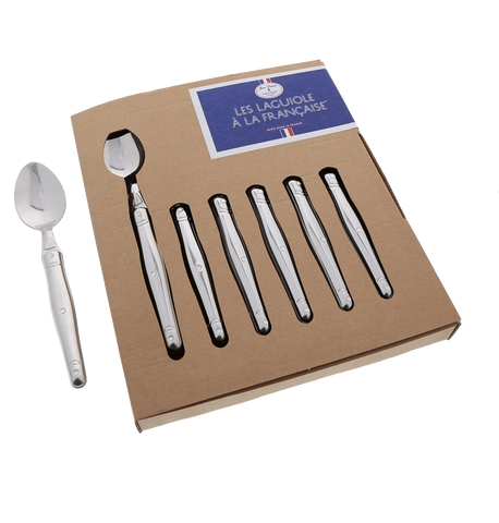 طقم ملاعق طعام أنيقة من مجموعة "Laguiole à la française" من جون دوبوست بتصميم مستوحى من الثقافة التقليدية الفرنسية لتضفي لمسة أناقة و جمال على طاولة الطعام. الملاعق مغلفة بشكل رائع مما يجعلها أيضاً مناسبة كهدية لمن تحب، و بإمكانك أيضاً إكمال الطقم بشوك و سكاكين من نفس المجموعة و التي تباع منفصلة.