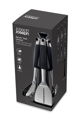 تشتمل المجموعة على: ملعقة مشقوقة، ملعقة تقليب مشقوقة ، مغرفة سباجيتي، ملعقة صلبة، مغرفة، مقشدة، وقاعدة دوارة