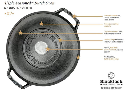 أسمت شركة لودج الأمريكية هذه المجموعة بلاك لوك على اسم أول مسبك حديد للشركة. كل قطعة من مجموعة بلاك لوك تحمل تاريخ مهم من سيرة الشركة محفور عليها لتذكرنا بعراقتها. يحتفل هذا القدر الهولندي بالعام ٢٠٠٢ و الذي فيه ابتكرت فيه شركة لودج أسلوب تهيئة الأواني في مصانعها قبل شحنها للعميل، ليصبح هذا الأسلوب هو القاعدة المتبعة بعد ذلك لجميع الشركات الأخرى و التي تنتج أواني الكاست أيرون. هذا القدر خفيف الوزن مثالي لتحضير العديد من الوصفات الشهية و للطهي البطيء و تحمير اللحوم. كل قطعة من مجموعة بلاك لوك تم تهيئتها ثلاث مرات لتغطيها طبقة طبيعية مانعة من الالتصاق لطهي سهل و نكهة رائعة و لسهولة التنظيف و العناية. مثل جميع أواني لودج من الكاست أيرون، تمتاز مجموعة بلاك لوك بقوتها و متانتها، و يمكن استخدامها على جميع أنواع المواقد و كذلك الشوايات، و هي مصنوعة في الولايات المتحدة الأمريكية.