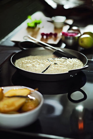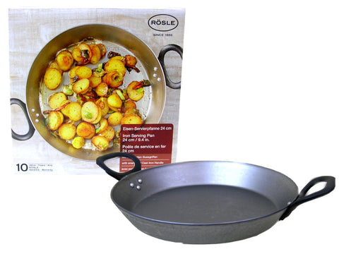 The Rösle iron serving pan with cast iron handles is suitable for any heat source: electric, ceramic, gas, induction and can even be put in the oven. The pan is not allowed in the microwave.Suitable for