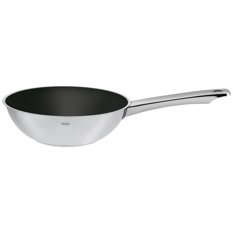 With its 28 cm diameter and 9 cm height, the wok offers ample space for cooking meat and vegetables. The 5 mm thick sandwich base distributes heat quickly and evenly. The long stainless steel handle on the wok makes it easy to handle. Made of 18/10 stainless steel with a black non-stick coating (temperature-resistant up to 260 °C).