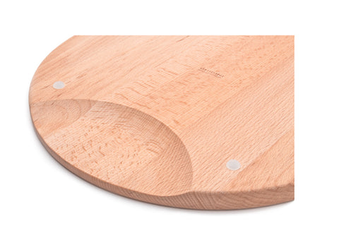 لوح تقطيع دائري مصنوع من خشب الزان الطبيعي و الغير معالج. تصميمه الأنيق يضفي لمسة جمال على مطبخك، و يضمن تقطيع سهل و عملي عند الاستخدام. له حافة عميقة لجمع السوائل عند التقطيع ليحافظ على مطبخك نظيفاً. مزود بأرجل من السيليكون لمنع الانزلاق، و مسكات جانبية لسهولة الحمل و التحريك.