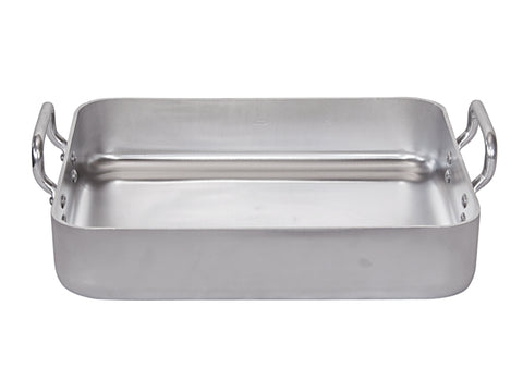 Rectangular pan in uncoated aluminium for roasting meat or vegetables in a conventional oven.