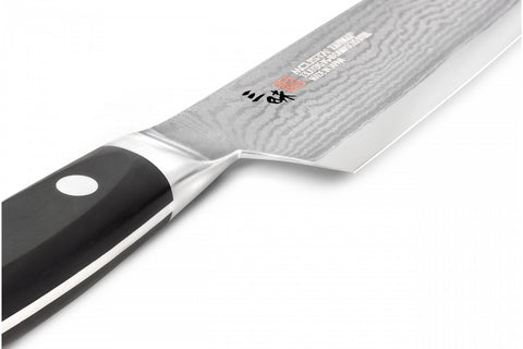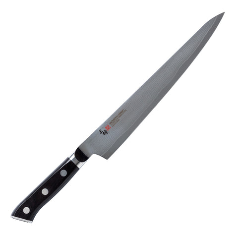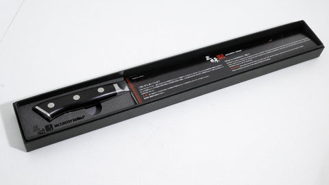 سكينة سوجيهيكي من مجموعة كلاسيك داماسكاس من زانماي. سكاكين السوجيهيكي اليابانية مخصصة لتقطيع اللحوم لشرائح بدقة و سهولة بفضل نصلها الطويل و النحيف، و بفضل الشفرة ذات الزاوية المزدوجة، فهي تضمن تقطيع متقن بحركة واحدة.