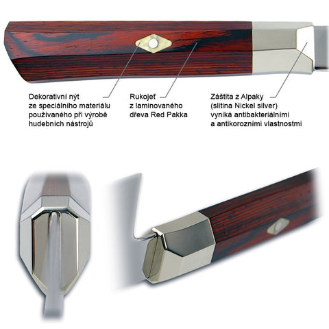 سكاكين سوبريم هامرد مزودة بمقبض هو الأفضل إطلاقاً للمطبخ، بتصميم فريد ثماني الأوجه من خشب الباكا الأحمر المقاوم للماء و بدعامة من الفولاذ. تصميم المقبض يوفر راحة و تحكم تام أثناء استخدام السكينة، و المقبض مزين أيضاً بمسمار من الموزايك المعدني و الذي يعتبر قمة الحرفية في صناعة السكاكين. و كل سكينة تأتي في علبة من الخشب الفاخر لحمايتها أثناء التخزين و النقل، و يجعل منها الهدية المثلى لمحبين الطهي.