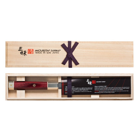 سكينة سوجيهيكي من مجموعة ألتيميت أرانامي من زانماي. سكاكين السوجيهيكي اليابانية مخصصة لتقطيع اللحوم لشرائح بدقة و سهولة بفضل نصلها الطويل و النحيف، و بفضل الشفرة ذات الزاوية المزدوجة، فهي تضمن تقطيع متقن بحركة واحدة.