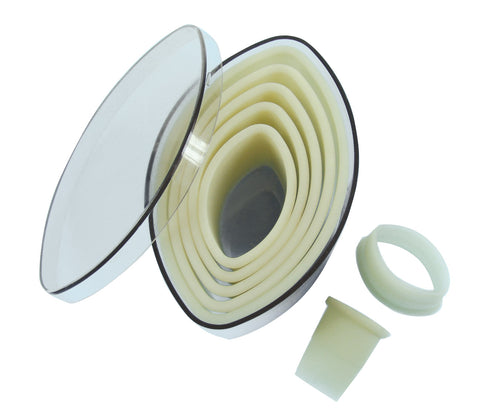 This box contains 7 plain or fluted oval pastry cutters, ideal for oval tart bases.