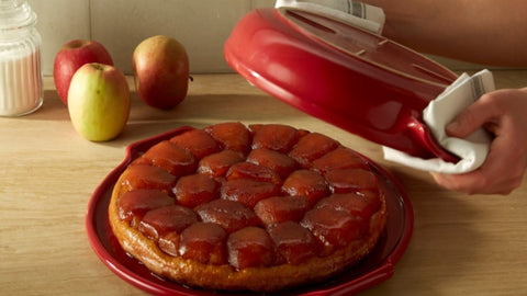 First make the caramel on the heat, then put the same dish directly in the oven. Turn out and present your tarte tatin directly on the serving platter.