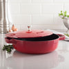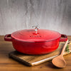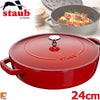 The round multi-function roasting pan is 11.6 cm high, measures 31.7 cm wide including handles (24 cm without) and has a capacity of 2.4 L. Its striking Color : Cherry red colour will also add a bright accent to your kitchen and your table when presenting food. Punctuate your cookware collection with an elegant multi-purpose roasting pan from Staub's roasting pan range and try out its unique self-basting system for yourself.