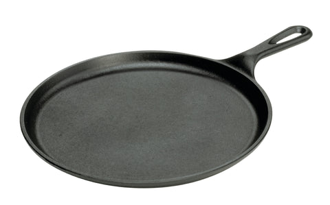 This round cast iron griddle pan is the perfect tool for cooking pancakes, pizza or quesadillas. The slightly raised edges keep oil, batter and other ingredients neatly contained. Cast iron can be used on a stovetop, in an oven or over a campfire.