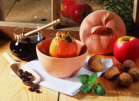 A nice tradition rediscovered, to prepare baked apples the way grandma used to make them. You can also prepare effortlessly other desserts with it, for example, Savarin or a small cheese casserole. Has space enough for one apple. The RÖMERTOPF® apple baker is made from pure, natural clay, and glazed from the inside for easy cleaning.