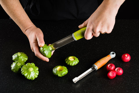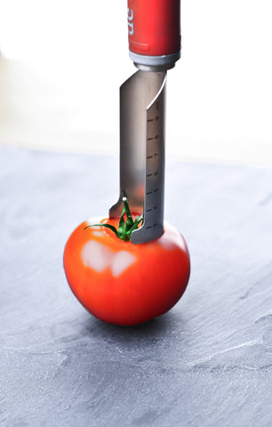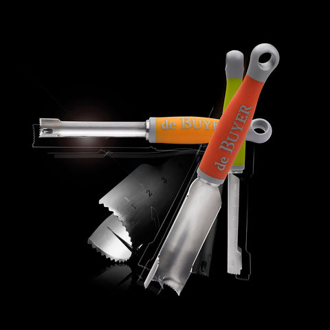 This practical tool is used to core, remove stalks or to stuff, in a very short amount of time. Ideal for any kind of fruit and vegetable, even very ripe ones, while preserving their texture thanks to a clean, close cut. "Soft Touch" non-slip handle, ergonomic for a safe and comfortable grip. The stainless steel coring tube is scaled, and the bottom edge is sharp and notched to easily penetrate any kind of fruit and vegetable. The wrought stainless steel helical blade is sturdy and very sharp. It avoids having to cut the side of the food to take the core out and therefore makes it easy to stuff. Available in 3 sizes.