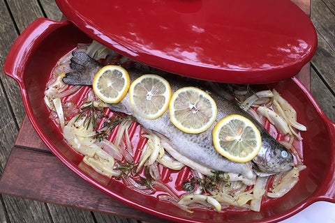 This ceramic steamer is specially designed for cooking fish and other seafood. The lid retains and circulate the steam enhancing the flavour while cooking the fish gently and evenly for tender and juicy meat. Add some vegetables and spices for a delicious recipe.