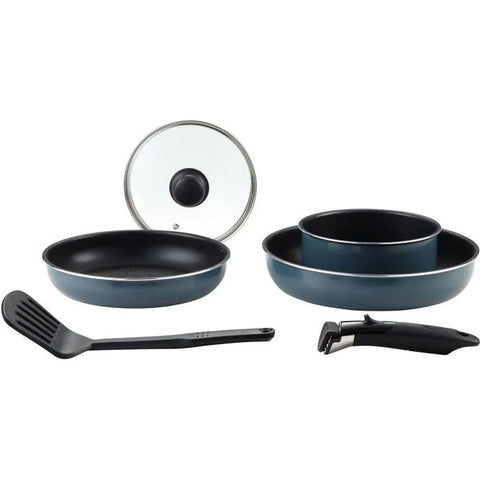 6-piece cookware set - Pressed aluminum - SITRAMOVIBLE range Whitford Xylan PFOA-free non-stick interior coating - Matt metal blue color - With glass steamer lid - With 2 pans 24-28 cm H 5-5.5 cm, 1 saucepan 18 cm H 8.5 cm, 1 removable Sitra handle and 1 nylon spatula