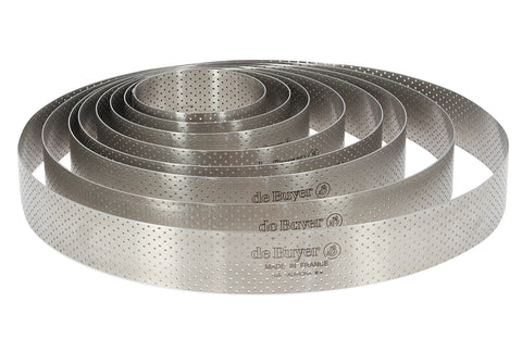Stainless steel round perforated tart ring ideal for tarts, tartlets, cakes and quiches, developed in partnership with the Ecole du Grand Chocolat Valrhona.