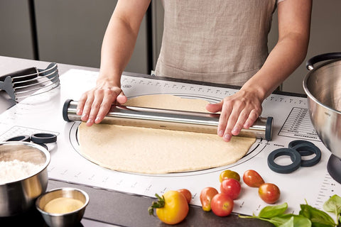 • stainless steel dough roller for rolling out perfect, even dough• adjustable: 0 mm, 2,5 mm, 5 mm, 7 mm, 10 mm dough thickness by attachable silicone rings• exactly the same dough thickness ensures uniform baking results• integrated measurement scale for reading off and setting dough widths up to 38cm.• high-grade stainless steel stick: hygienic, taste- and odour-free• easy to clean