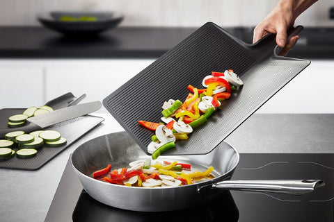 It couldn’t be easier: first the fruit, vegetables, fish, meat etc. are cut on the high-grade plastic blade-friendly cutting board and then conveniently poured into the required cookware or bowl without spilling. This is ensured both by the soft-touch handle and also by the practical possibility of bending the middle of the cutting surface. The non-slip ridges on the underside of this black kitchen aid provide an added safety feature.