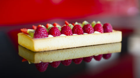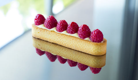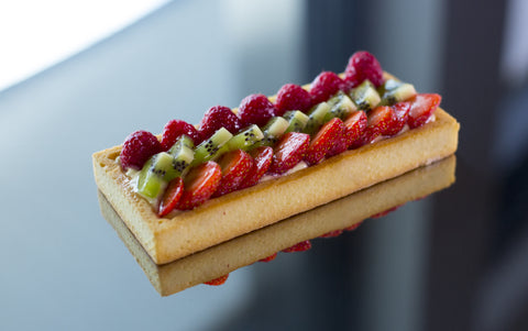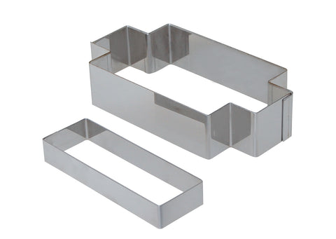 طقم مكون من قالب تشكيل حلويات من الستانلس ستيل على شكل مستطيل بزوايا حادة و قطاعة عجين. الطقم من تصميم الحرفي الماهر فرانك ميشيل و الحائز على العديد من الجوائز في صناعة الحلويات