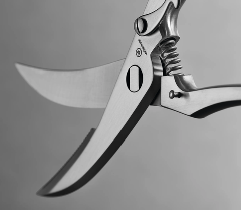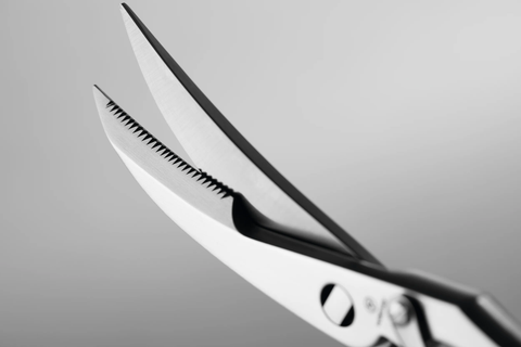 These Poultry Shears are the ideal tool for chicken. turkey. duck or goose. The sharp. slightly curved stainless-steel blades are ideal for skinning. jointing and spatchcocking poultry; the Poultry Shears can easily get through thinner bones. An internal spring between the blades and the sturdy handles ensures